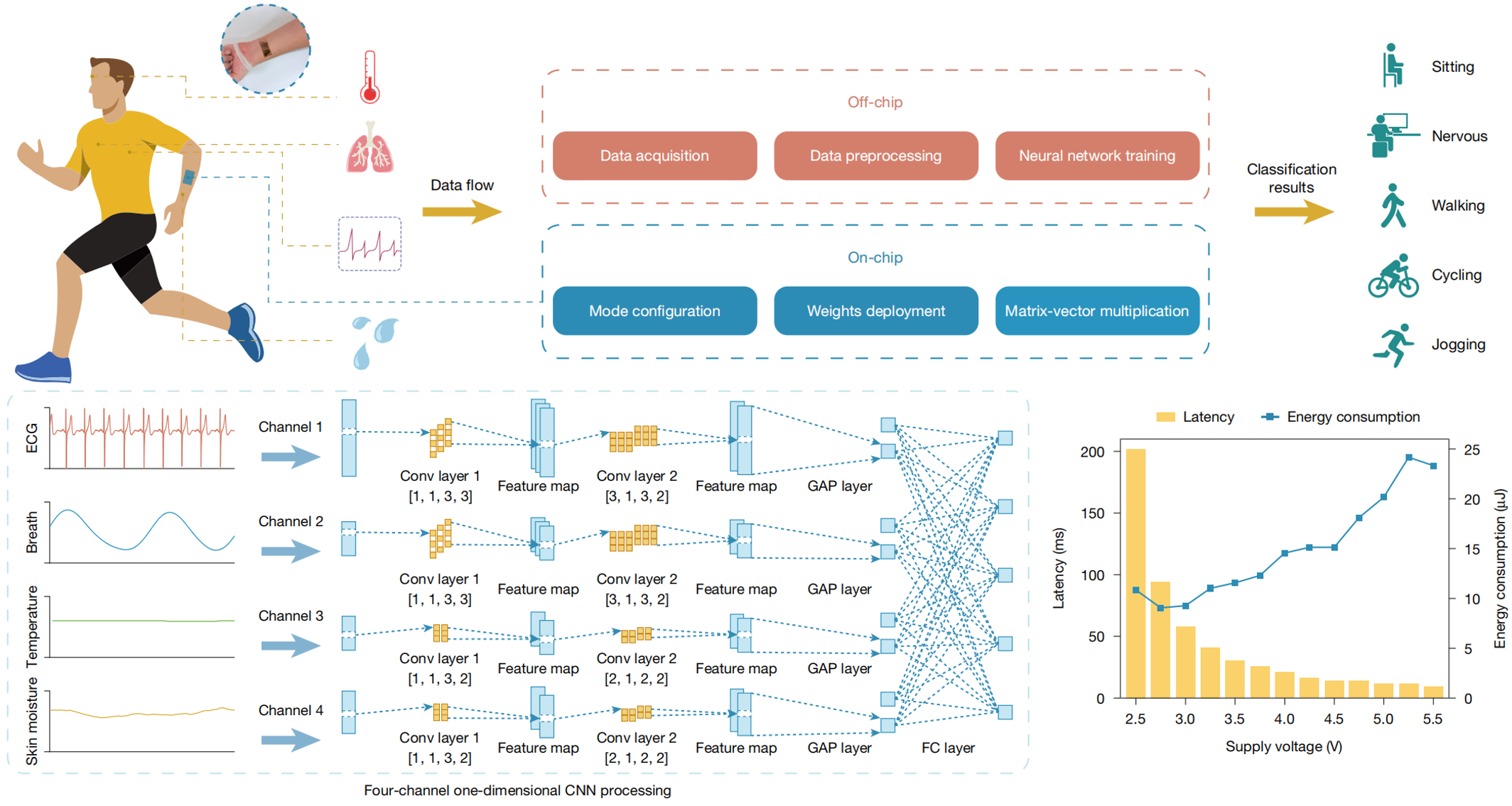 图4. FLEXI用于日常活动监测与分类的系统流程:数据采集、预处理、神经网络训练与片上推理;可一次性部署的四通道卷积神经网络结构;FLEXI-1不同电压条件下单次推理的延迟与能耗