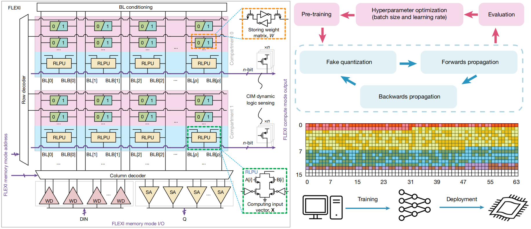 图2.FLEXI存内计算架构电路;结合量化感知训练与贝叶斯优化的双环训练策略;芯片上权重分布可视化