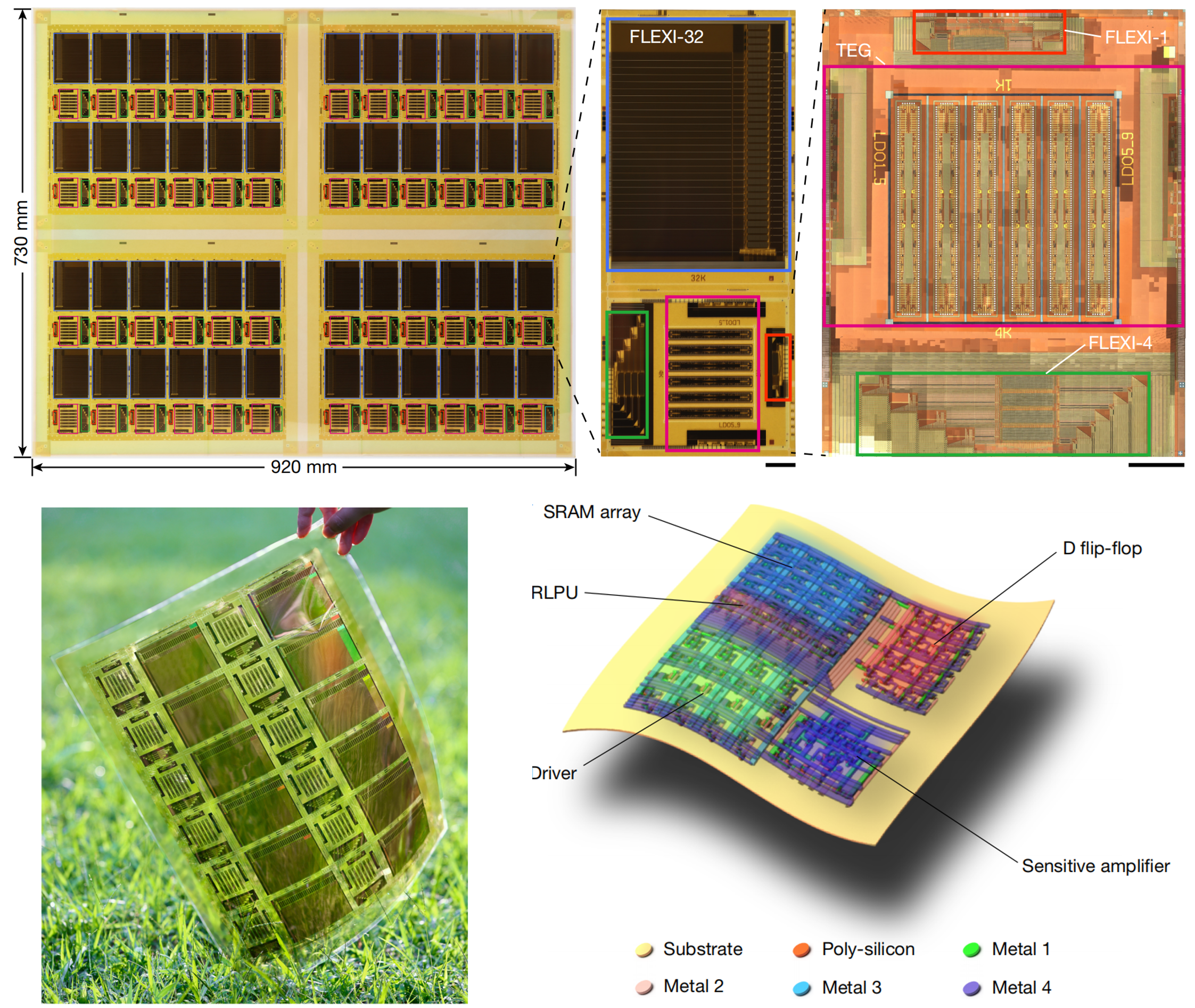 针对上述瓶颈,清华大学集成电路学院任天令教授团队提出了FLEXI——面向边缘智能加速的柔性数字存内计算芯片。FLEXI采用低温多晶硅(LTPS)CMOS工艺制造,兼具轻薄、低成本和高能效等优势。该系列包括FLEXI-1(1 kb)、FLEXI-4(4 kb)和FLEXI-32(32 kb)三种规格,最多集成约26.5万个晶体管。每颗柔性芯片在单一基片上集成了SRAM存储阵列、计算单元及外围电路。通过覆盖制造工艺、电路结构与算法设计的跨层级协同优化(CLCO)策略,FLEXI实现了稳定、高速、并行的点积运算,在工艺波动与机械形变条件下仍保持优异的精度、面积效率与能效表现。