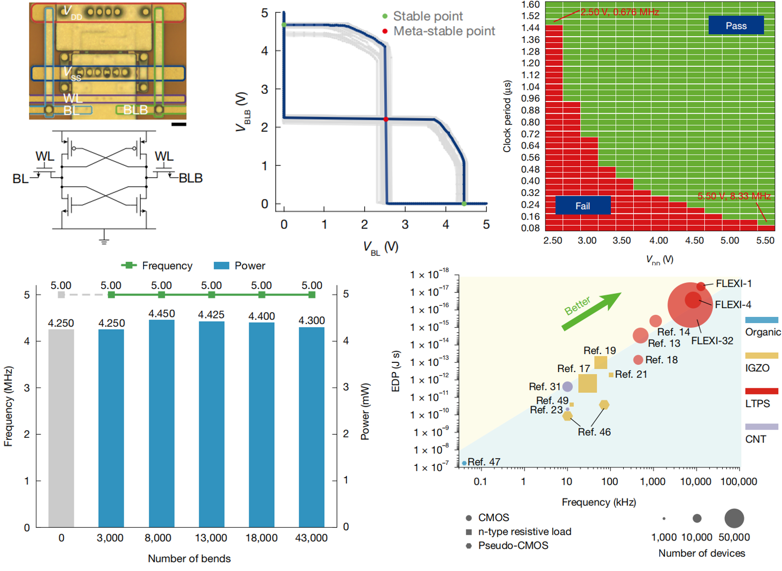 图3. 6T-SRAM柔性单元显微图、电路结构及传输特性;FLEXI-4在存算模式下的Shmoo测试;FLEXI-4经受43000次折叠测试过程中的性能监测;FLEXI系列芯片与其他柔性计算芯片的综合性能对比