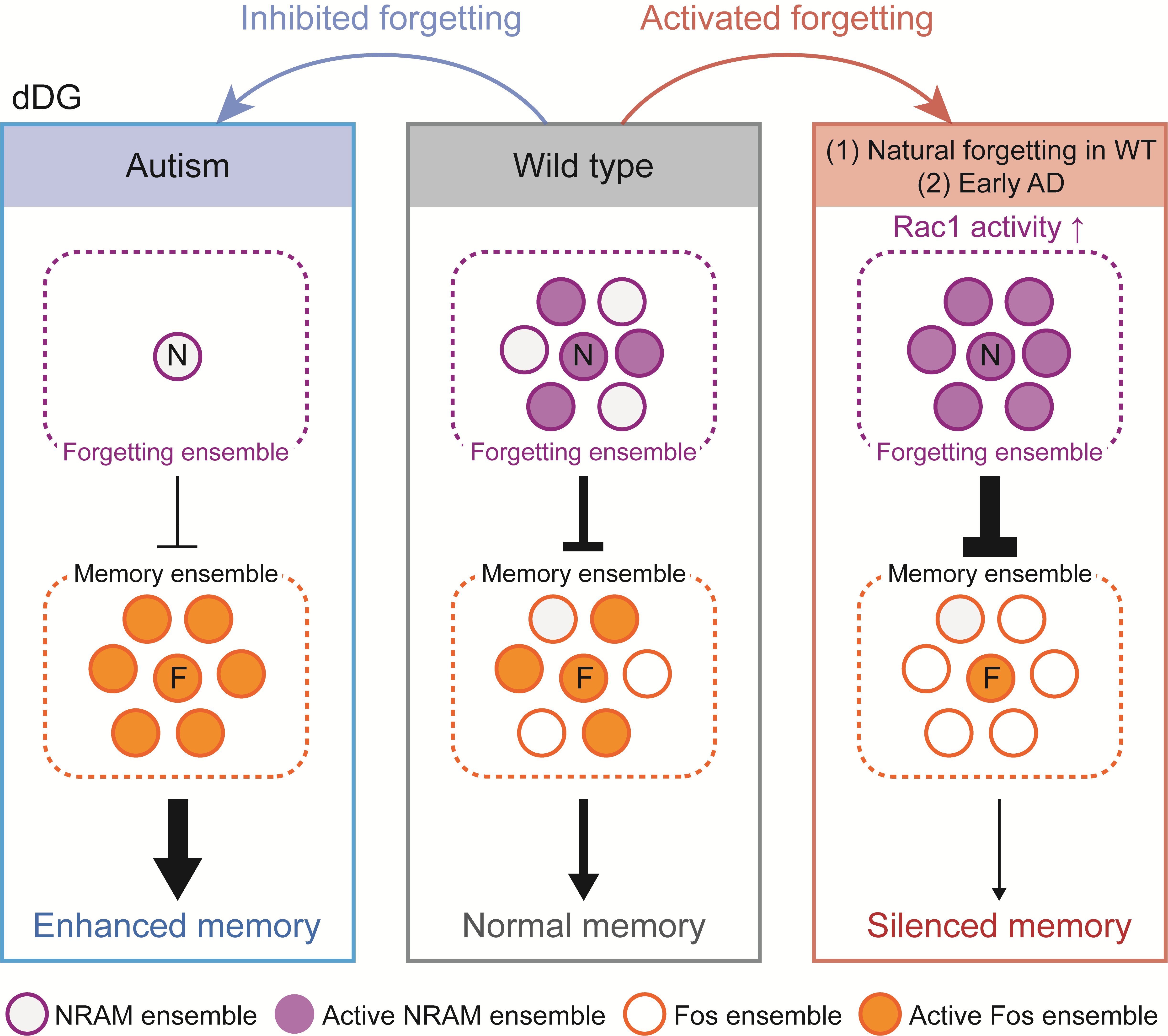为了验证这一因果关系,研究人员利用化学遗传学手段对这两群神经元进行了双向操控。结果表明:如果在记忆测试时抑制“遗忘印迹”(NRAM ensemble)的活性,原本已经遗忘的记忆可以重新提取;反之,如果在记忆清晰时人为激活这个遗忘印迹,小鼠的记忆提取表现会显著降低。进一步的实验表明,操纵遗忘印迹的活性,能够直接反向调节“记忆印迹”(Fos ensemble)的重激活水平。这说明,遗忘并不是记忆痕迹的物理抹除,而是通过激活这一特定的遗忘印迹细胞群,对记忆印迹进行了功能性的抑制。