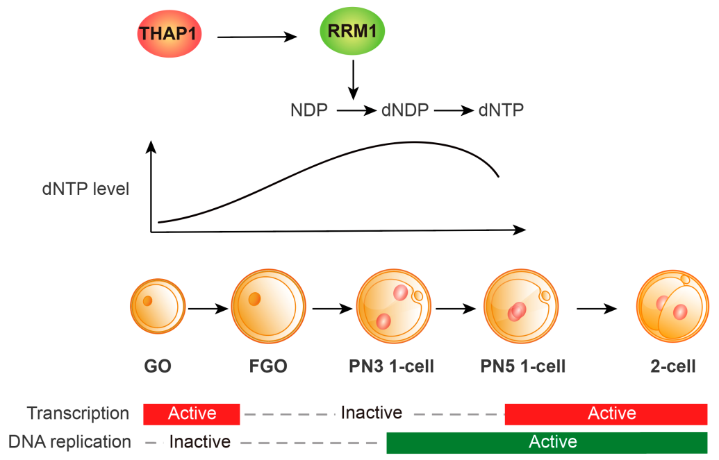 THAP1通过调控下游基因Rrm1转录,保障受精后第一个细胞周期所需dNTP供应,支持1细胞向2细胞转变及合子基因组激活(ZGA)