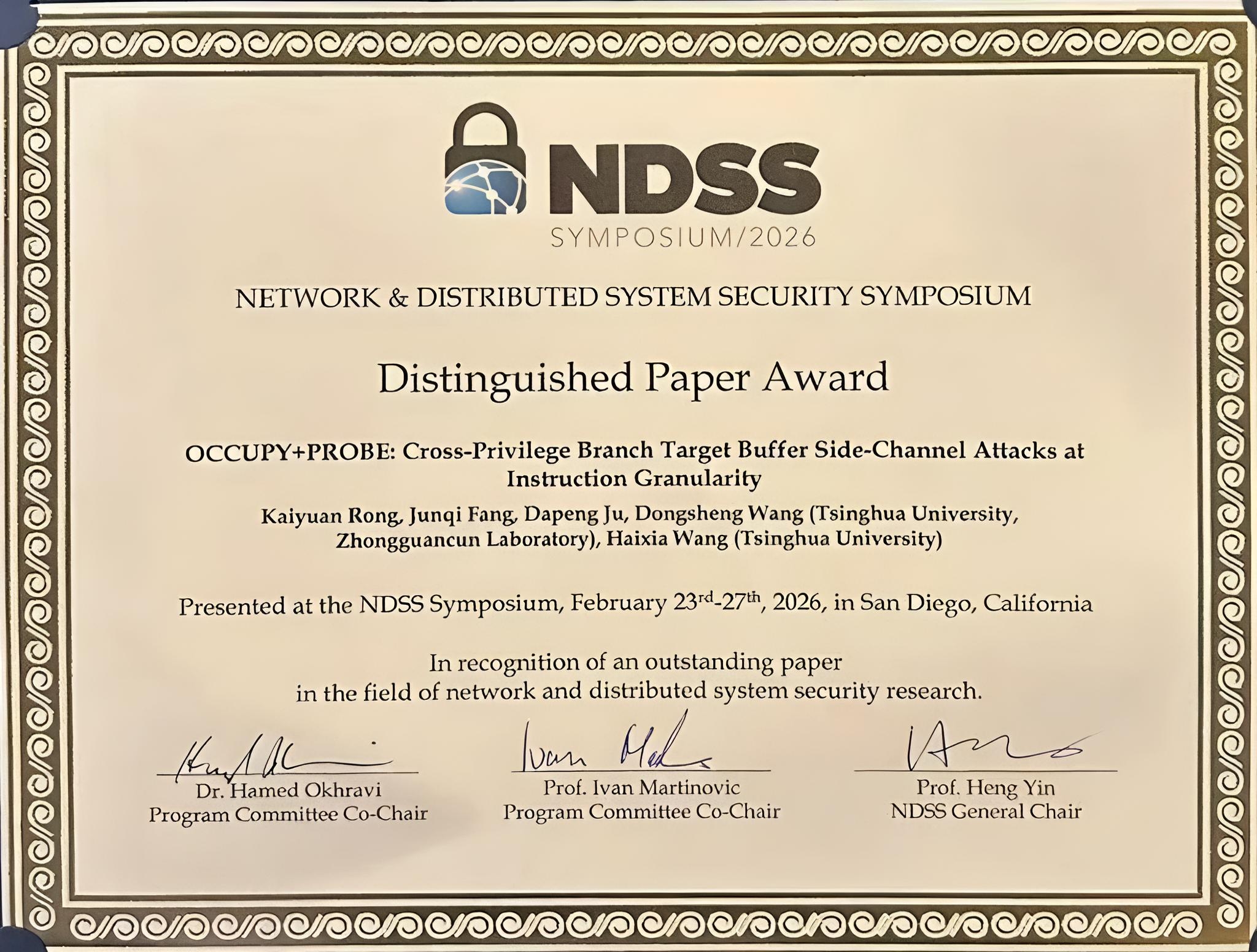 清华新闻网3月3日电 近日,第三十三届网络与分布式系统安全研讨会(NDSS)在美国圣迭戈举行。清华大学计算机系高性能计算研究所2022级博士生融凯源和2024级博士生方骏祺(导师为汪东升教授)发表的论文“OCCUPY+PROBE:指令粒度的、跨权限域的分支目标缓冲器侧信道攻击”(OCCUPY+PROBE: Cross-Privilege Branch Target Buffer Side-Channel Attacks at Instruction Granularity)获得杰出论文奖(Distinguished Paper Award),同时被大会录用并收录至会议论文集。