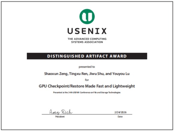 清华新闻网3月3日电 2月24日至26日,第24届USENIX文件与存储技术会议(USENIX Conference on File and Storage Technologies, FAST)在美国圣克拉拉举行。清华大学计算机系存储实验室研究论文“GPU检查点保存和恢复的快速和轻量级方案”(GPU Checkpoint/Restore Made Fast and Lightweight)获得杰出技术贡献奖。该论文第一作者为计算机系2021级博士生曾少勋,导师为计算机系副教授陆游游。