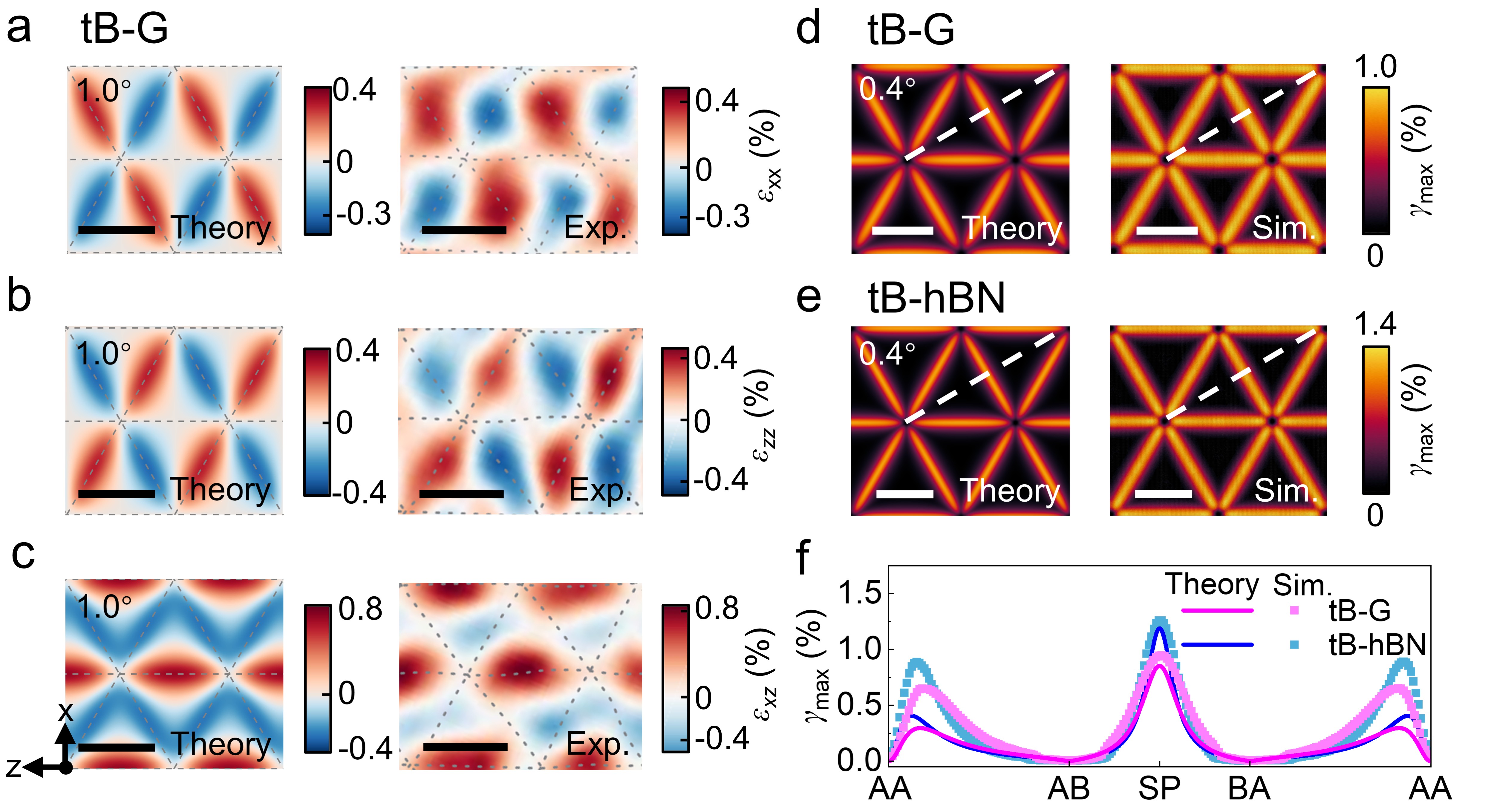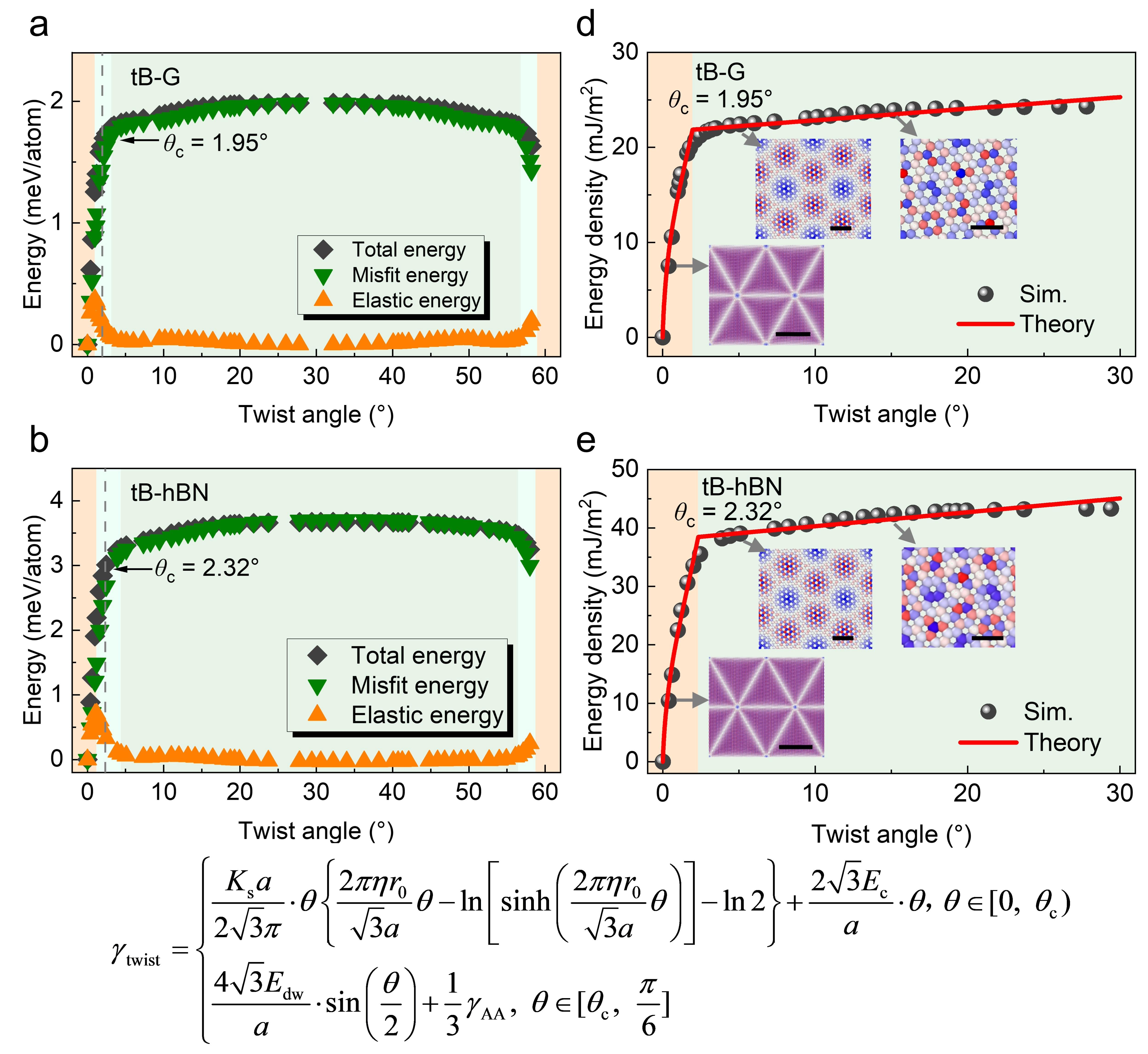 针对上述问题和挑战,清华大学航院以及力学与工程交叉研究院李晓雁教授课题组基于各向异性位错理论,建立了一套全解析的理论模型,清晰地揭示了“扭转角度—结构变形—能量特征”三者间的精确定量关系。在小扭转角度下,扭转二维材料的莫尔云纹主要表现为由分位错构成的三角形网络结构。该模型给出了扭转二维材料的局域旋转场、应变场及应力场的完整解析表达式(图2-4),并阐明了能量密度随扭转角度变化的非线性规律(图5)。当扭转角度较大时,莫尔云纹则呈现以AA堆垛为核心的六边形畴结构及伴随的畴壁网络。针对这一结构特征,该模型同样建立了能量密度与扭转角度之间的解析关系。在0°到30°的扭转角度范围内,随着角度增大,扭转二维材料的能量密度呈现先快速升高、后逐渐趋于饱和的变化趋势(图5)。为进一步验证和完善理论模型,针对扭转双层石墨烯(tB-G)、扭转六方氮化硼(tB-hBN)及扭转三层石墨烯(tT-G)体系开展了大规模原子模拟,并将理论预测与模拟结果和已有研究进行了对比。模型所预测的局域旋转场、应变场、应力场以及能量密度随扭转角的变化规律,均与原子模拟结果以及已有实验和模拟数据高度吻合(如图2、图3、图5),表明该理论模型能够准确描述扭转二维材料的结构变形与能量演化特征。该研究不仅深化了对二维材料莫尔超晶格物理机制的认知,也为系统表征该类材料的变形与能量特征提供了一套完整的解析理论框架,为主动设计和精准调控扭转二维材料的物理特性提供了重要的理论基石。