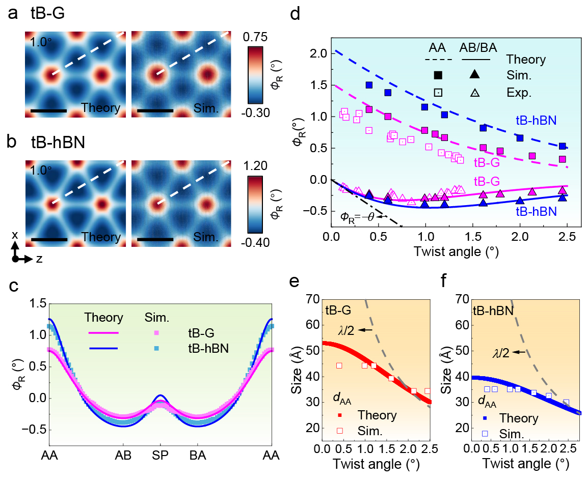 清华新闻网3月5日电 近年来,相关研究表明,对二维材料进行层间扭转调控可诱导出非常规超导、关联拓扑态、铁电性等一系列新奇的物理现象。这些现象主要源于材料内部形成的莫尔超晶格结构,该结构能够显著改变原有晶格的对称性并重构电子能带。在微小扭转角度下,原子尺度重构会引发纳米尺度变形,对材料的电子特性与拓扑性质产生显著影响。准确理解并有效调控这类纳米尺度变形,对新型功能器件的设计与研发具有重要意义。然而,迄今为止仅有很少的实验研究通过4D STEM直接表征了扭曲双层石墨烯的位移场和应变场,且现有研究多聚焦于特定材料体系,尚未建立具有普适性的理论框架,限制了该领域的进一步发展。