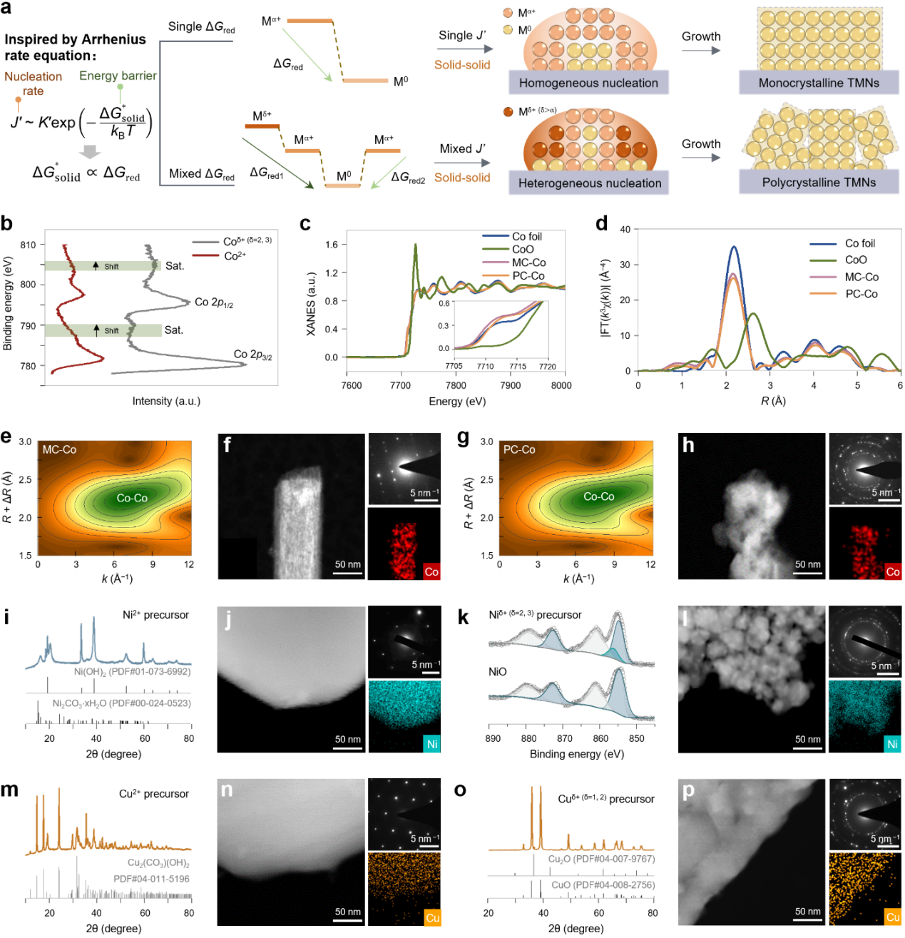 近日,清华大学深圳国际研究生院周光敏副教授团队基于归纳出的固相成核类阿伦尼乌斯公式,提出了前驱体价态门策略,通过调控固相前驱体中金属离子单一/混合的价态,简易地制备了一系列MC/PC-TMNs(M=Co,Ni,Cu)。有趣的是,“前驱体价态”这一本征参数在液相合成中未受到重视。因为高价态金属离子在还原为低价态金属离子后仍可在液相中自由扩散,随后与溶液中已有的低价态金属离子均匀混合,故无法仅通过前驱体价态的调控就实现单多晶的可控合成。但在固相合成中,其却“摇身”变为实现简易合成的关键本征参数。由于晶格扩散能垒高,混合价态的金属源易钉扎形成不同的成核中心,形成多晶;而均一价态的金属源在近稳态下则形成均一的成核中心,形成单晶。
