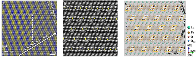 图2. HAADF图像定量分析LuFe2O4.22中的点阵序参量。(a)[100]带轴下LuFe2O4.22的选区衍射结果,q代表超衍射点的调制矢量。(b)[100]带轴下的HAADF图像。(c)-(f)基于HAADF图像对Lu原子和Fe原子各自位移情况的定量分析结果。