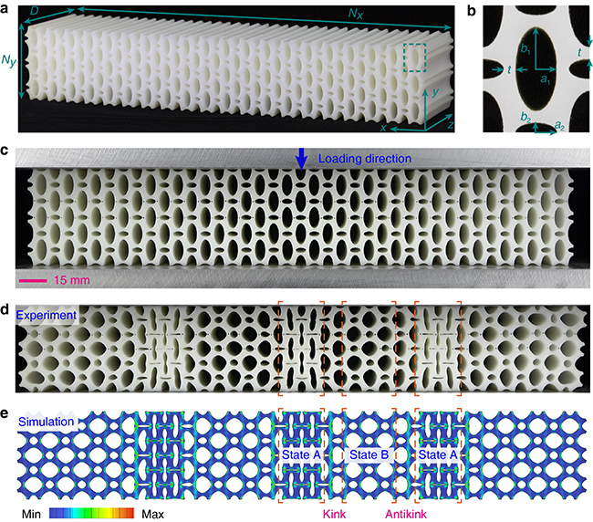 该工作构建了一类多稳态力学超材料,在准静态均匀压缩载荷作用下,实现了有序局域变形,其本质是具有缺陷不敏感的静态拓扑孤立子。这一发现突破了固体中局域变形的位置、尺度通常随机而难以准确预测的传统认知。