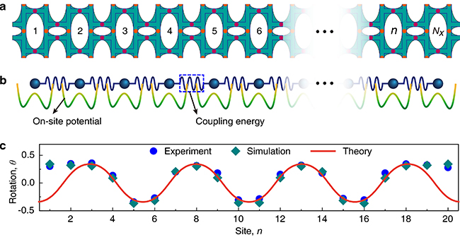 图2.力学超材料的一维双稳态模型和周期孤立子解,结果证实实验观察到的有序局域变形具有明显的静态孤立子特性。