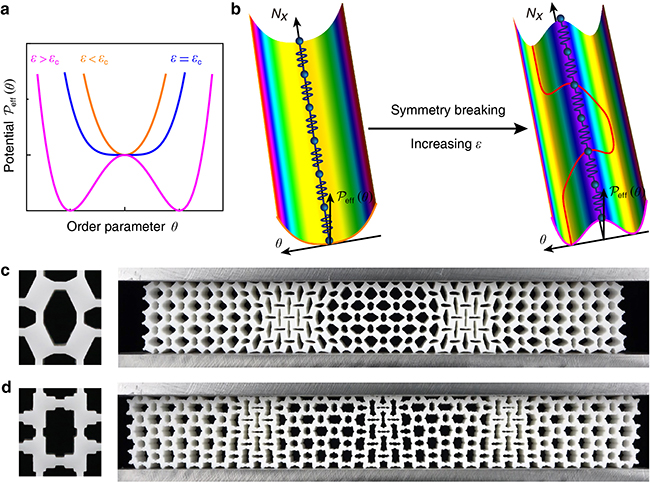 图3.可控有序局域变形的静态周期孤立子机理示意图:(a)元胞等效原位势能随压缩应变演化示意图;(b)多稳态系统结构相变机制与静态周期孤立子框架示意图;(c-d) 基于静态孤立子框架编程有序局域变形。