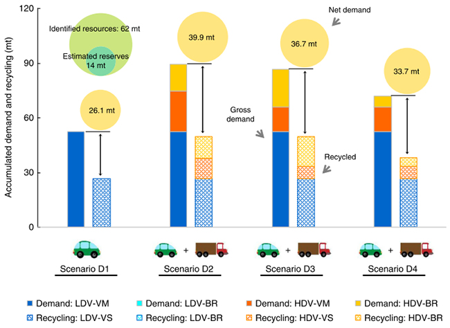 聚焦上述关键问题,研究团队建立了全球交通部门系统仿真模型,实现了较大空间尺度、时间尺度、车型覆盖、多指标的系统仿真。对重型车电动化资源影响的研究表明,重型车领域全面电动化将明显提升以锂资源为代表的关键金属需求量,应谨慎选择技术路线,同时通过降低单车续航里程、提升电池寿命等手段减少重型车电动化对矿产资源的冲击。对燃料电池汽车发展的铂族金属需求量研究表明,全球尺度下铂族金属资源可以有效支撑燃料电池汽车发展,但区域尺度下资源供需高度错位,对于少数低政治稳定性国家资源的高度依赖将带来巨大的供应风险。