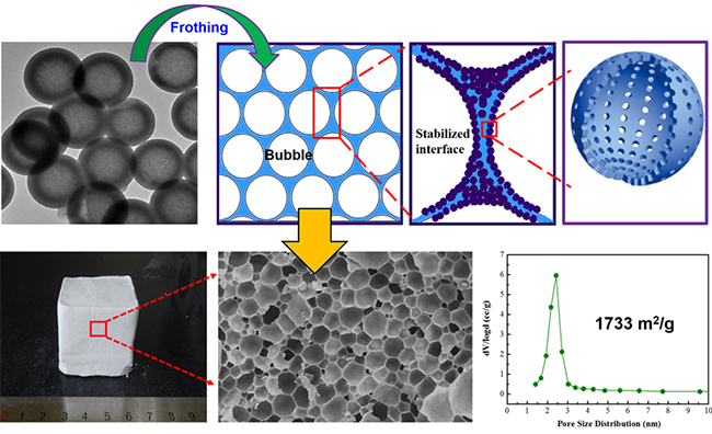 获奖论文介绍了一种新的泡沫陶瓷制备方法。以利用乳液法制备的纳米级氧化硅中空介孔球为原料,通过颗粒稳定泡沫法,制备了由微球组装而成的具有三维骨架结构的泡沫材料。采用该方法所制备的超稳定泡沫在干燥烧结后,可得到由氧化硅介孔空心球组装而成的、形貌完整的三维泡沫材料。这种新材料具有以下多级孔结构:通过气泡演变而成的均匀大孔;中空微球的空腔;氧化硅中空介孔球壳层上的放射状介孔(孔径为2-3nm)。该材料的比表面积高达1000-1700m2/g,是目前报道的所有泡沫陶瓷材料中比表面积值最高的,甚至高于无机气凝胶材料。这种具有多级孔结构的泡沫材料通过在不同尺寸上构建孔结构可以满足更多应用领域,有望在吸附、过滤、药物缓释、催化剂载体等技术领域发挥作用。这种颗粒稳定泡沫法生产成本低廉、环境友好,且不引入杂质,因此,被认为是一种有发展潜力的泡沫结构成型方法。