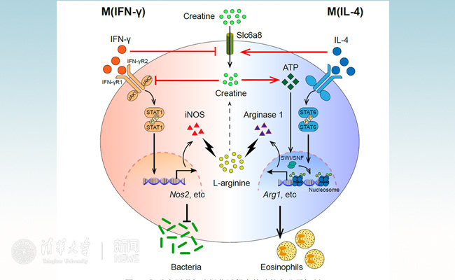 清华新闻网8月7日电 2019年8月6日,清华大学医学院胡小玉课题组联合药学院陈立功课题组在《细胞》(Cell)子刊《免疫》(Immunity)杂志在线发表了题为 《Slc6a8介导的肌酸转运和积累通过调控细胞因子应答来重编程巨噬细胞的极化》(Slc6a8-mediated creatine uptake and accumulation reprogram macrophage polarization via regulating cytokine responses)的研究论文。该文章揭示了L-精氨酸的下游代谢产物肌酸在干扰素IFN-γ介导的巨噬细胞活化[M(IFN-γ)]和白介素IL-4介导的巨噬细胞活化[M(IL-4)]中分别发挥着关键调控作用。