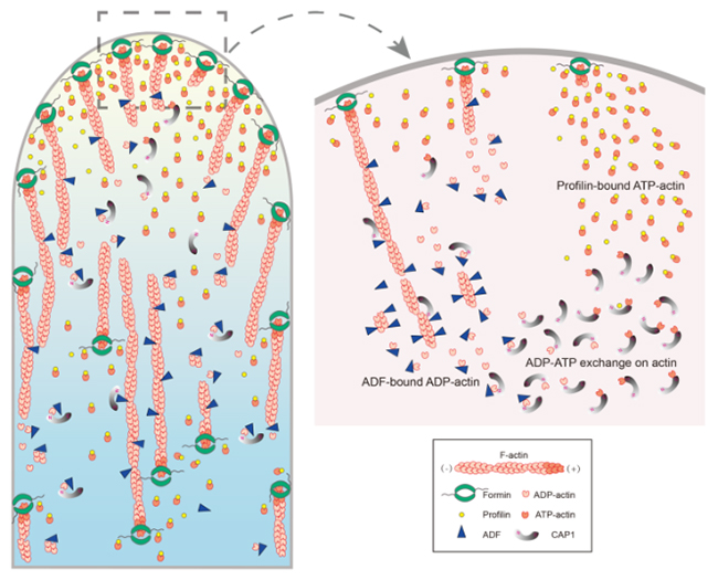 黄善金课题组后续的研究证明,微丝从花粉管顶端质膜的聚合主要是由formin/profilin元件所控制。由于推测花粉管中G-actin主要以G-actin-profilin复合体的形式存在,产生和维持一个可聚合的ATP-G-actin-profilin复合体库是花粉管顶端微丝聚合调控模型中的关键步骤。相比动物profilins能够促进G-actin的核苷酸交换,植物profilins缺乏或抑制G-actin的核苷酸交换,解聚的ADP-G-actin必须先转换成ATP-G-actin然后再转交给profilin形成ATP-G-actin-profilin复合体才能重新进入微丝聚合循环。另外,由于微丝解聚因子(actin-depolymerizing factor; ADF)是花粉管微丝骨架动态转换的关键因子,解聚的G-actin应该主要以ADP-G-actin-ADF复合体的形式存在。由于ADF偏好结合ADP-G-actin并抑制其核苷酸交换,如何使ADP-G-actin和ADF解离并使其转化为ATP-G-actin至关重要。