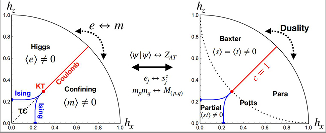受到诺贝尔物理奖得主拉福林(R. B. Laughlin)用波函数来刻画分数量子霍尔拓扑物态的启发,清华大学物理系张广铭教授课题组另辟蹊径,从量子波函数的角度来探讨可能的量子拓扑相变的机制。他们借助于张量网络态的表示理论,构造了一个可调控的量子多体波函数,并发现可映射到一个二维严格可解的经典统计模型:阿什肯—特勒(Ashkin-Teller)模型。借助于经典模型的严格解,发现环面编码模型中的量子拓扑态严格对应经典统计模型的“部分有序态”,并可以精准确定拓扑相变的临界位置和量子拓扑相变的微观机制。进一步研究还发现,在电磁对偶的调控路径上,量子波函数会经历一个量子的考斯特里兹—邵勒斯(Kosterlitz-Thouless)相变点,进入无能隙的库仑气体状态,其中电荷之间的屏蔽相互作用演变为长程的库仑相互作用,类似于从超导态到正常电子态的转变。这种库仑气体态在失去电磁对偶后即可发生电荷凝聚或者处于电荷禁闭相,由“退禁闭量子相变”理论刻画,也是超越朗道对称性自发破缺的相变普适类。需要指出的是,考斯特里兹--相变是刻画二维经典系统中的超越朗道相变范式的拓扑相变理论,是由大卫-邵勒斯和迈克尔-考斯特里兹在1973年提出的,并获得2016年诺贝尔物理奖。