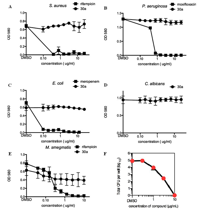 2014年刘刚课题组与合作伙伴首次报道基于 (+)-Calanolide A改造的硝基呋喃香豆素类结构(nitrofuran-coumarins,NFCs)是一种针对活动性结核和潜伏性结核分枝杆菌的高效抑制剂。(+)-Calanolide A是从马来西亚热带雨林植物藤黄科胡桐属植物长茎胡桐(Calophyllum lanigerum)中分离得到的具有抗HIV-1和抗Mtb活性的天然香豆素衍生物。在Gates基金资助下,刘刚教授团队及其合作者通过筛选十余万个化合物发现Calanolide衍生物具有较好的抗活动性结核和潜伏性结核双重活性,并进一步细致研究了Calanolide 的构效关系,优化出硝基呋喃香豆素类衍生物NFCs,对活动性结核和潜伏性结核的抑制活性均可达0.08 μg/mL(图1)。此外,相对于其他常见的革兰氏阳性菌和阴性菌,NFCs展示出对Mtb的选择性抑制作用以及对感染人巨噬细胞的Mtb 的高活性(图2)。
