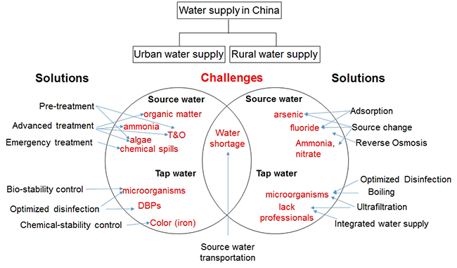 中国的供水是一个二元系统,这也是中国城乡差异的一个表现。城乡供水都面临着水源短缺和水质污染问题。水资源短缺主要依靠长距离调水来解决。城市供水单位普遍关注有机物、氨氮、藻类和水源突发污染,同时也关注饮用水中的微生物和消毒副产物。微生物也是农村供水普遍担心的问题,同时氟砷和氨氮也是某些区域的农村供水所面临的问题。城市供水得益于处理工艺的升级改造,目前大量采用的臭氧-活性炭深度处理工艺能够确保水厂出水满足严格的《生活饮用水卫生标准》。但是,该工艺复杂、成本昂贵,不适用于农村供水。因此,除基本的消毒外,农村供水水质提升主要依靠寻找优质水源、自动化的超滤装置或者城乡一体化供水等措施来解决。对于使用高氟、高砷水源的部分农村地区,特种吸附剂是帮助当地农民改善供水的可行措施。类似的挑战可能会在世界上其他国家或地区遇到。因此,中国所采取的可行措施将会为处于不同发展阶段的其他国家提供借鉴。