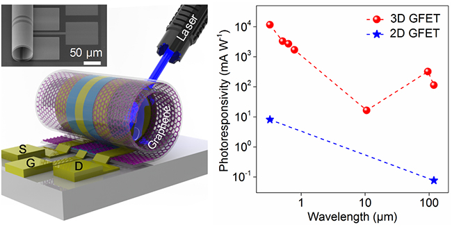 清华新闻网2月15日电 近日,清华大学微纳电子所教授刘泽文、北京交通大学电子信息工程学院邓涛副教授联合团队在国际著名学术期刊《纳米快报》(Nano Letters)上发表了题为《基于三维石墨烯场效应管的高性能光电传感器》(”Three-Dimensional Graphene Field-Effect Transistors as High Performance Photodetectors”)的研究论文。该论文利用自卷曲方法制造了一种微管式三维石墨烯场效应管(3D GFET),可用作光电传感器,实现对紫外光、可见光、中红外光、太赫兹波的超高灵敏度、超快探测。