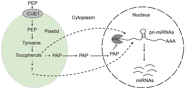 在这项研究中,研究者通过正向遗传筛选获得到了一个严重影响miRNA产生的突变体CUE1。CUE1是一个定位于叶绿体内膜的转运蛋白,它可以将化合物PEP转运至叶绿体内并通过Shikimate 通路代谢产生三种芳香族氨基酸 (Tyr, Phe, and Trp)。遗传学分析表明,三种芳香族氨基酸中的Tyr,而不是Phe和Trp,为miRNA的积累所必需。进一步分析发现,Tyr通过生成下游代谢产物维生素E调控miRNA生成。