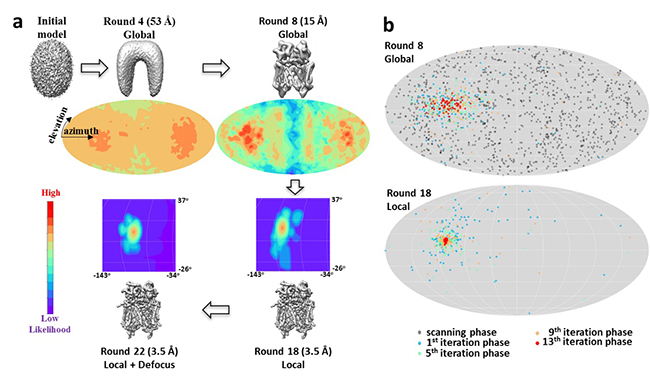 图1.基于粒子滤波的三维重构算法示意图。a)从初始模型开始到最终结构的计算收敛过程,其中的彩色图表示在旋转空间中参数搜索的似然度分布图。b)基于蒙特卡洛算法的随机参数搜索和重点采样。经过多轮的迭代搜索,分散于整个参数空间中的采样点收敛于最可能的参数附近,采样点的分布反映了所测定参数的概率密度分布。