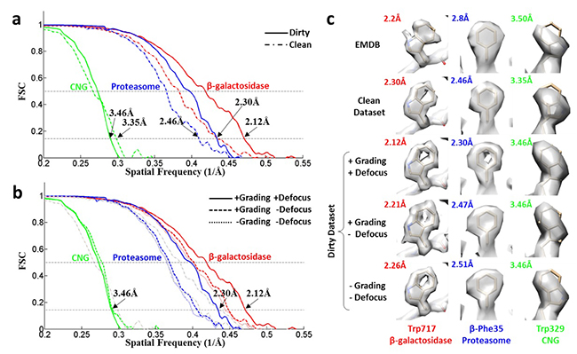 图2.THUNDER的计算结果对比。三个测试数据集,CNG,Proteasome和β-galactosidase,被用来进行测试。分别选取包含很多坏照片的脏数据集(dirty)和使用其他方法筛选掉坏照片的干净数据集(clean)进行计算,脏数据集给出了更好的结果,说明新算法对坏照片高度容忍(Grading),并且能充分利用好照片中的信息。另外,通过对成像的离焦参数进行精修,也能大幅提高分辨率,说明了新算法对高维参数搜索的鲁棒性。a)和b)分别给出了分辨率的测量曲线,c)是通过对几个特定的氨基酸密度来对比不同的计算结果,其中EMDB表示的是之前发表的结构(第一行),现有的计算结果分辨率显著提高(第三行)。