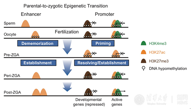 通过对斑马鱼配子及早期胚胎中的组蛋白修饰的研究,研究人员首先系统地检测了组蛋白修饰H3K4me3、H3K27ac、H3K27me3和H3K36me3在精子、卵子、4细胞时期、256细胞时期和穹顶期胚胎基因组内的分布特性。这些实验结果发现,亲本增强子区域的表观遗传学记忆会在受精前后快速的擦除。令研究人员惊讶的是,精子基因组增强子上的这种“去记忆化(dememorization)”甚至在受精之前就已经开始发生。卵子基因组的去记忆化则主要发生在受精之后。子代增强子的表观遗传标记则是在基因组激活前后(1000细胞)开始建立。与此不同的是,启动子区早在4细胞时期就会大量出现组蛋白乙酰化,提示启动子区域会进入一种提前预备的状态。一旦ZGA发生,这些提前预备的启动子将会被进一步修饰并进入启动或抑制程序。为了研究这种启动子提前乙酰化的可能功能,研究人员进行了母源敲低三个关键组蛋白乙酰转移酶。这种敲低导致了胚胎乙酰化的降低并引起基因组激活的异常以及胚胎死亡。