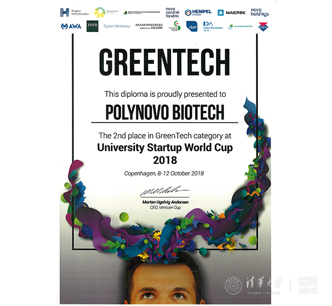 清华新闻网10月19日电 10月7-13日,聚创生物(Polynovo Biotech)团队代表清华大学赴丹麦参加2018年大学创业世界杯(University Startup World Cup)全球总决赛。经过激烈的角逐,聚创生物团队最终从30多个国家的55支全球总决赛入围队伍中脱颖而出,在绿色技术(Green Tech)小组的9支国际团队中位列第二,获颁“Top Two Best”奖项,该成绩为中国队伍自参加该比赛以来的历史最好成绩。