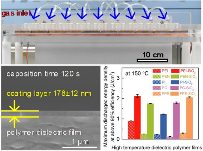 为解决上述问题,课题组提出采用等离子体增强化学气相沉积技术在聚合物薄膜表面快速沉积具有宽能带隙的纳米绝缘层,以提高电极/介质界面处的电荷注入势垒,从而抑制聚合物电介质薄膜在高温下的泄漏电流,大幅提高了聚合物电介质薄膜在高温、高电场下的储能特性。该方法能够实现在大气压条件下快速沉积,具备连续处理的能力;其室温沉积特性使得该方法直接适用于任意聚合物介质薄膜。通过引入卷对卷薄膜加工技术和动态沉积,可实现规模化、连续化生产。该方法具有无污染、简便、高效、低成本等特点,并且可与现有聚合物电容器薄膜生产线相兼容。目前课题组已在该技术领域申请多项国内专利和PCT专利,并正与相关企业联合进行产业化开发。