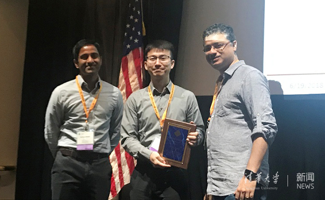 ACM计算机系统测量和建模学会联合主席阿迪蒂亚·阿克拉(左)和学会主席维沙尔·米斯拉(右)为黄隆波助理教授颁奖