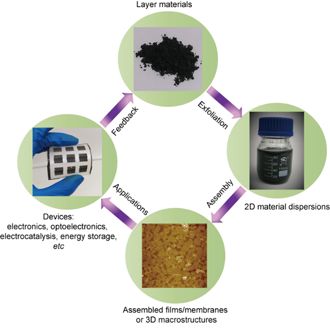 二维材料相关研究近年来呈现出爆发式的增长趋势,这使得插层和剥离具有层状结构的块体材料以制备二维材料成为研究热点。相比于自下而上的制备方法,通过块体层状材料的剥离制备二维材料及其分散液的方法具有成本低、可大规模生产和与溶液加工兼容的优势。基于这种自上而下剥离的方法制备的二维材料及其分散液具有广阔的应用前景,包括电子、光电子、能源转换和储存、界面功能涂层等。