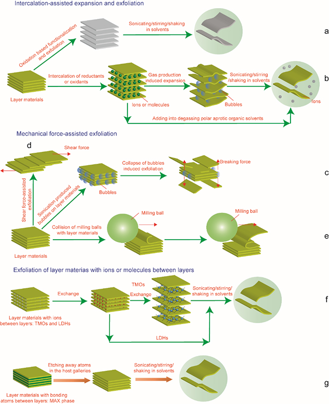 图1. 剥离层状材料制备二维材料的方法总结