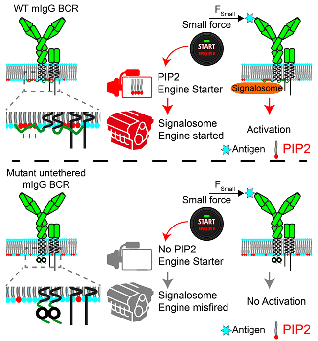 基于记忆性B淋巴细胞受体胞内区富集磷脂酰肌醇4,5-二磷酸具有超低机械力活化阈值的机制概念手绘图(原稿:清华大学赵兴旺)