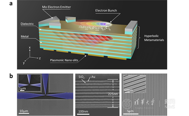 (a) 片上集成切伦科夫辐射源,(b)电子显微镜照片:(左)片上平面电子发射源、(中)双曲超材料、(右)表面等离子激元周期纳米狭缝。