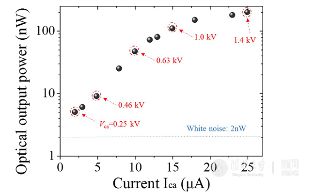 为验证这一重大发现,课题组成员经过两年多的不懈努力,连续攻克了片上平面电子发射源、双曲超材料、表面等离子激元周期狭缝等纳米结构制作和测试的诸多瓶颈难点,让电子从几十纳米曲率半径的钼尖端发射出来后,在芯片表面保持40纳米距离直线飞行200微米,最终观测到了无阈值的切伦科夫辐射。辐射波长为500~900纳米,电子能量仅为250~1400电子伏特,比目前报道的同类实验所需几十万电子伏特的电子能量降低了2~3个数量级。实验获得了200纳瓦的辐射光输出功率,与其它利用纳米结构获得的切伦科夫辐射相比,输出功率高了2个数量级以上。