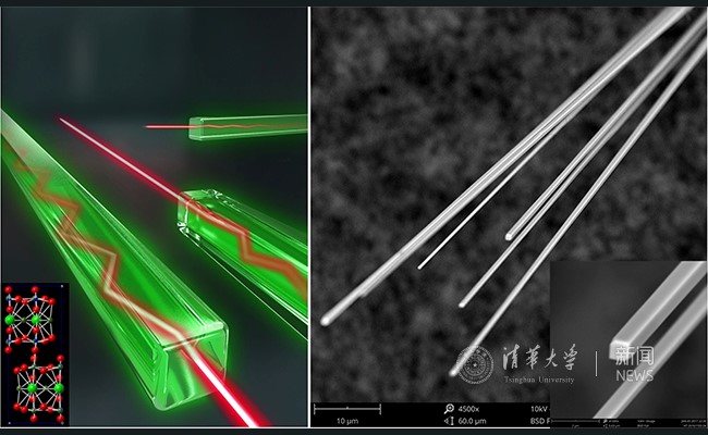 纳米线波导实现光放大的示意图(左),纳米线的扫描电子显微镜照片(右)。