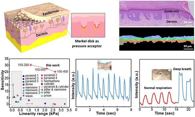 (从上到下,从左到右)皮肤的微结构示意图,皮肤微结构和仿生结构照片,线性度和灵敏度与前人工作性能对比,腕部脉搏和呼吸监测结果。