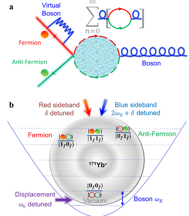 图 1:费米子——反费米子散射过程和该过程与囚禁镱离子系统的映射关系。(a) 费米子、反费米子和波色子之间相互作用的费曼图。(b) 在囚禁镱离子系统中实现该相互作用的哈密顿量涉及的编码和操作。