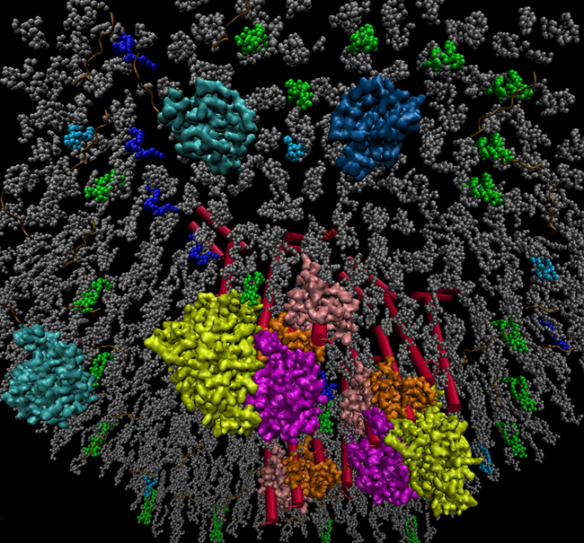PIP2水解与再生代谢作用形成的正反馈环路增强B淋巴细胞的跨膜信号转导和免疫活化。图为在细胞质内仰视细胞质膜视角,PIP2(绿色),DAG(蓝色),PA(淡蓝色),其他膜脂(灰色),DGKζ(青色),PIP5Kα(靛蓝色),BCR(红色),Lyn(粉色),Syk(橙色),Blnk(紫色),PLCγ2(黄色)。