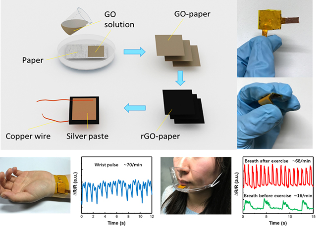 任天令教授团队创新性地提出了石墨烯纸基压力传感器的新方法,可通过热还原手段,将多层混合的氧化石墨烯溶液与纸材料转变为多层石墨烯纸。利用石墨烯纸层间的空气通道以及纸材料独特的微孔结构,使石墨烯纸在压力作用下,阻值发生显著变化,从而大幅度提高了对压力的探测灵敏度。通过选取适当的石墨烯纸类型和纸的层数,还可以进一步提升压力传感器的灵敏度。该器件在可穿戴应用方面可以实现脉搏、呼吸以及多种运动状态的精确检测。此外,这一新型石墨烯纸基器件还具有环保、低成本、高柔性等突出优点。