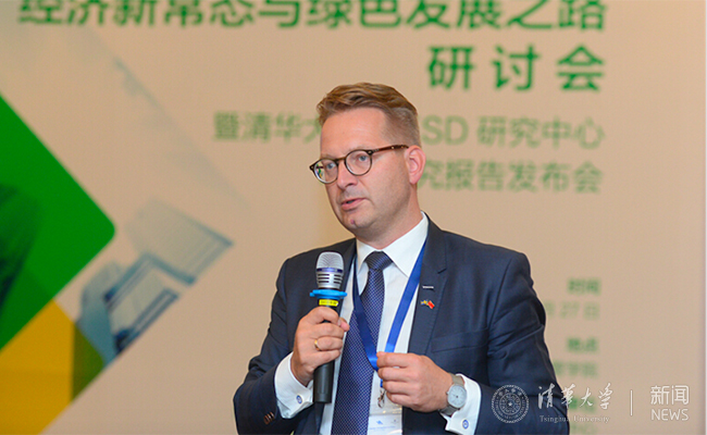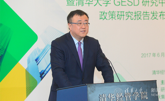 清华大学经济管理学院副院长、清华大学绿色经济与可持续发展研究中心主任钱小军致辞。司宏峰 摄