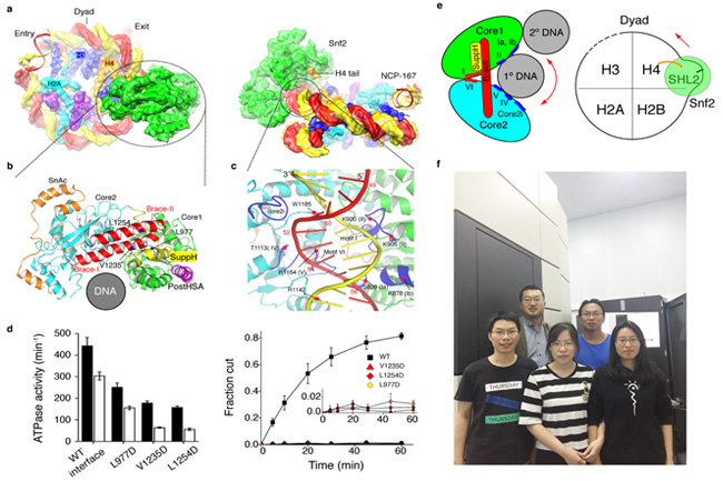 Snf2-核小体复合物结构及染色质重塑机理。(a) Snf2-核小体复合物电子显微镜结构的两个不同视角,虚线部分在(b)、(c)放大再分析;(b) 激活状态的Snf2结构;(c) Snf2-DNA 相互作用;(d)基于结构的Snf2活性分析(左图,ATP水解活性;右图,染色质重塑活性);(e) Snf2染色质重塑机理模型,双箭头(左图)表示Snf2的两个主结构域的相对运动方向,单箭头(右图)表示“DNA 波”传递方向;(f) 染色质重塑研究团队(前排左起:夏显,刘晓玉,李美静;后排:李雪明,陈柱成)。