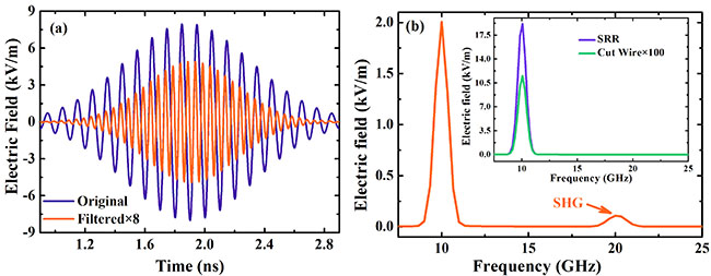 图为(a)非线性超分子的透射电场时域谱;(b)透射电场频域谱。嵌入图:两个非耦合的超原子仿真频域透射谱。