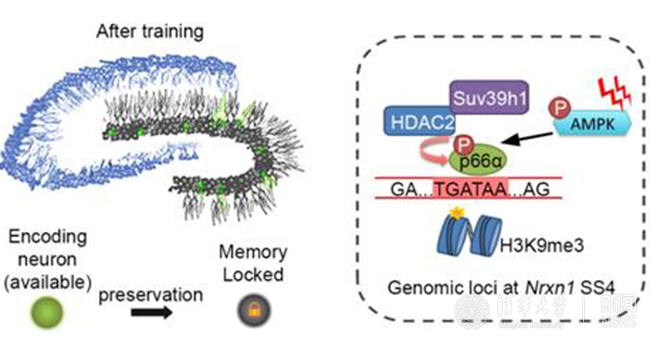 在清华大学生命学院、医学院的多个实验室的帮助下,研究者进一步发现了从神经元激活到膜蛋白剪切体变化的细胞信号通路。他们的研究揭示了神经元活动会激活腺苷酸活化蛋白激酶(AMPK)通路,从而磷酸化DNA的结合蛋白p66α。结合在神经轴突连接素1(Nrxn1) 可变剪接位点4的p66α蛋白在磷酸化后招募了表观遗传调控因子HDAC2(组蛋白去乙酰化酶2)和Suv39h1,并建立了抑制性的组蛋白修饰。这个组蛋白微环境会通过对转录过程中耦联的RNA剪接过程进行调控,从而形成稳定的新剪切异构体蛋白。当人为干预这个细胞过程(Suv39h1基因敲除小鼠),使得神经元活动诱发的表观修饰印迹消失时,小鼠已经形成的记忆的稳定性下降,容易被新的学习内容覆盖。