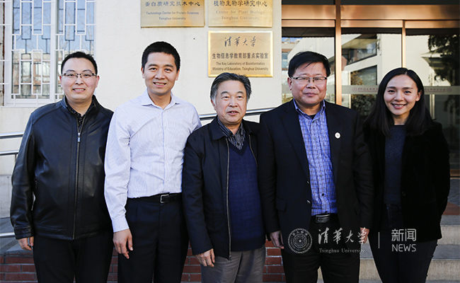 3月9日,参与国际酿酒酵母基因组合成计划的中国科学家代表在清华大学媒体见面会后合影,自左至右依次为:李炳志、戴俊彪、杨焕明、元英进、沈玥。 沈伯韩 摄