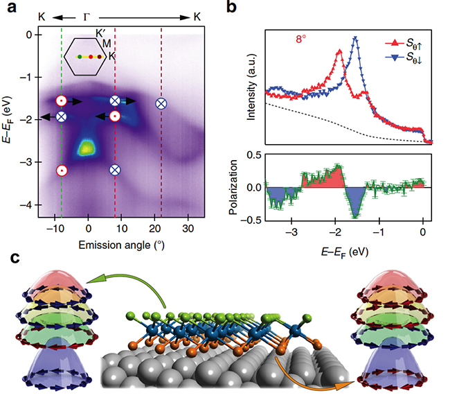(a)单层硒化铂薄膜的能带结构。红色和蓝色标记该点自旋的方向,红色和蓝色分别为自旋方向垂直直面朝外和朝里。(b)自旋方向朝里和朝外的电子强度对比和自旋极化率。(c)单层硒化铂的电子自旋结构示意图,上下两层硒原子中的电子具有方向相反的自旋结构。