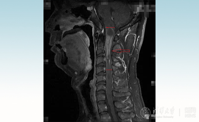 从人体的后脑到颈部一直向下延伸到尾椎,是一根长长的管道,里面是一根手指粗细的脊髓,它就像一根“电缆”,里面布满了导线一样的神经,大脑通过这根“电缆”下达指令,并接收来自身体各个部位的信号。而延颈髓肿瘤,上端濒临脑干禁区,下端延伸几公分甚至几十公分,挤压正常的脊髓,导致神经传导出现了严重问题,患者因此出现无力、莫名的疼痛甚至瘫痪的症状。“延髓是生命中枢,相当于总闸,牵一发动全身。”王贵怀说。