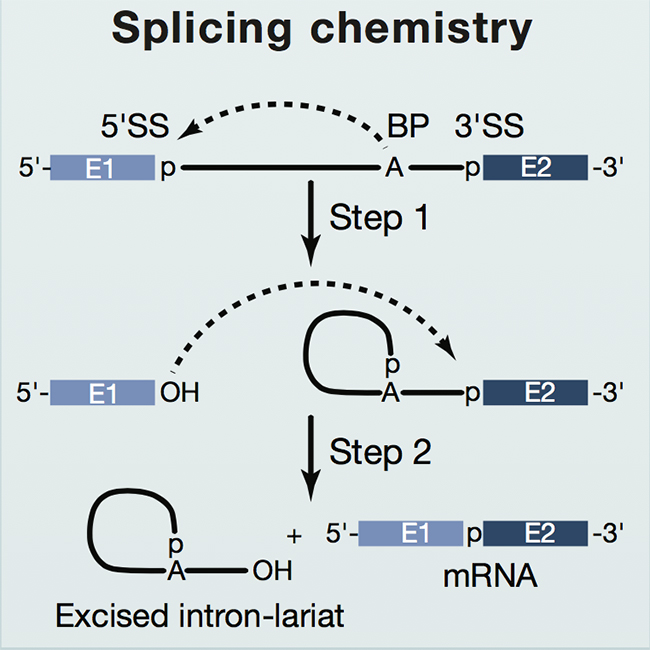 由于真核生物中的基因编码区中存在不翻译成蛋白质的序列(称为内含子),染色体DNA转录出来的前体mRNA(pre-mRNA)并不直接参与蛋白质翻译,而是需要先将其中的内含子片段去除,才能进入核糖体进行蛋白质合成。内含子的去除需要通过两步转酯反应来实现:首先,位于内含子序列中下游被称为分支点(branch point sequence)的序列中有一个高度保守的腺嘌呤核苷酸(A),其2’羟基亲核攻击内含子5’末端的鸟嘌呤(G),于是第一步反应发生,形成套索结构;然后,5’外显子末端暴露出的3’-OH向内含子3’末端的鸟嘌呤发起攻击,第二步反应发生,两个外显子连在一起。通过这两步反应,前体信使RNA中数量、长度不等的内含子被剔除,剩下的外显子按照特异顺序连接起来从而形成成熟的信使RNA(mRNA)(图1)。