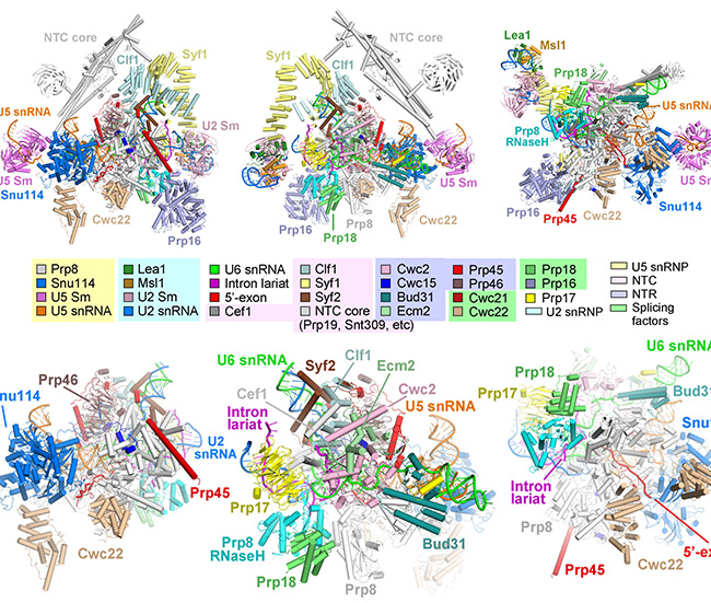 2015年8月至今,施一公教授研究组共报道了剪接反应中5个关键状态剪接体复合物的高分辨率结构,分别是3.8埃的预组装复合物tri-snRNP、3.5埃的激活状态复合物Bact complex、3.4埃的第一步催化反应后复合物C complex、4.0埃的第二步催化激活状态下的C* complex以及3.6埃的内含子套索剪接体ILS complex。这5个高分辨率结构所代表的剪接体状态,基本覆盖了整个剪接通路中关键的催化步骤,提供了迄今为止最为清晰的剪接体不同工作状态下的结构信息,大大推动了RNA剪接研究领域的发展。