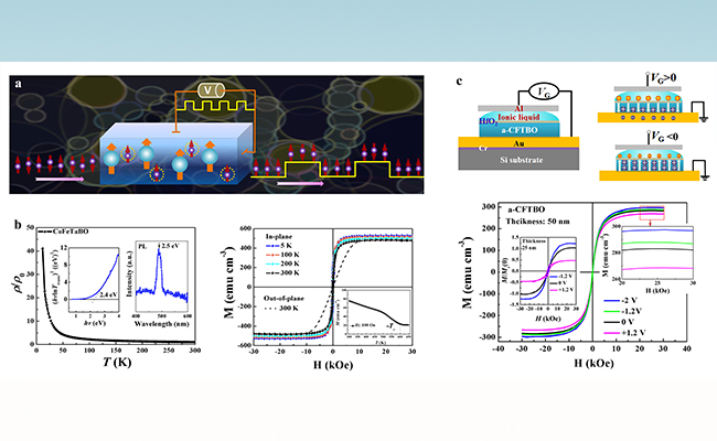 探索高居里温度磁性半导体,并基于此材料开发室温实用型自旋电子器件一直是自旋电子学领域的研究目标。针对这一关键科学问题,陈娜及其合作者通过在居里温度远高于室温的磁性金属玻璃中引入诱发半导体电性的元素使磁性金属转变为半导体(图1b),并基于该p型磁性半导体与n型单晶硅集成实现了p-n异质结和p-n-p结构的制备,表明该新型磁性半导体可以和现有硅基半导体工业兼容。与此同时,对于载流子调制磁性的磁性半导体而言,其电学和磁学性能相互关联;而基于此新型磁性半导体制备的电控磁器件通过外加门电压调控其载流子浓度,实现了室温磁性的显著调控,进一步证实该p型磁性半导体的本征电磁耦合特性(图1c)。